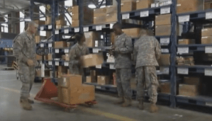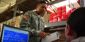 Automated Logistical Specialist 92A stocking and entering data in a warehouse.