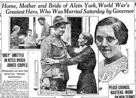 Alvin was immediately promoted to Sergeant and awarded the Distinguished Service Cross, which was soon upgraded to the Medal of Honor. He was returned to the United States as a celebrity and given a ticker tape parade through New York. He was pestered by filmmakers and advertisers, but he returned home to Tennessee. A week after he returned home on June 7th 1919, the Governor of Tennessee, Albert H. Roberts came to Pall Mall and before a crowd of hundreds, performed the marriage ceremony for Alvin and Gracie.