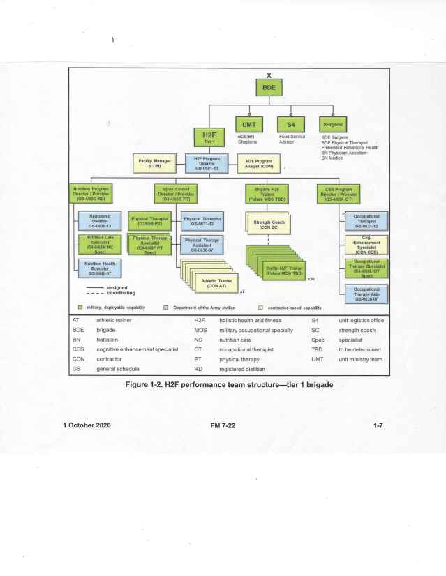 On October 1st, 2020, the Army published a new Field Manuel (FM) 7-22, Holistic Health and Fitness. This makes the program command policy, army wide. The Army physical year (FY) starts October 1st, and funds have already been allocated for current FY 2021, to start implementing H2F. Every Brigade is getting a new H2F staff, to be under the direction of the Brigade Commander. The H2F Program Director will be civil service GS-13, starting salary of about $78,000, although the solicitations say that salary will be negotiated with non-prior civil service applicants. Under the Program Director, will be a Captain, Nutrition Director, with civilian and military dietitians, a Captain Injury Director/Provider, with military and civilian physical therapists and a contracted civilian athletic trainer for each battalion, a Captain Combat Enhancement Director, with civilian and military occupational therapists. There will also be civilian strength coaches advising the professional military physical trainers. In FY 2023, construction is to start on a 40,000 square foot “Soldier Performance Readiness Center” (SPRC), for EACH BRIGADE. That is about twice the size of most current army fitness centers. The Brigade H2F Team will be housed in the SPRC, and every company in the Brigade will rotate through the SPRC several times weekly. Daily physical training will not necessarily be the first hour of the day, for everyone. Until the SPRC’s are constructed, H2F teams will utilize whatever facilities are available, like current fitness centers.