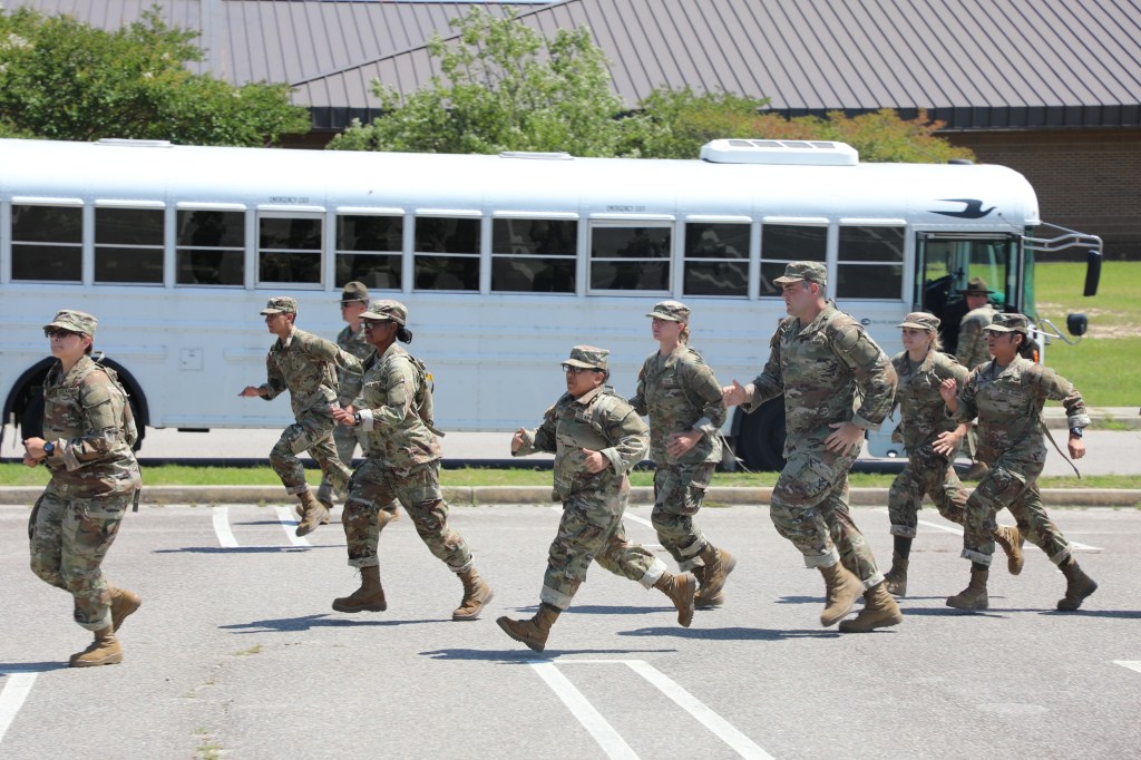 Drill sergeant yelling. Get off bus go there and form up.