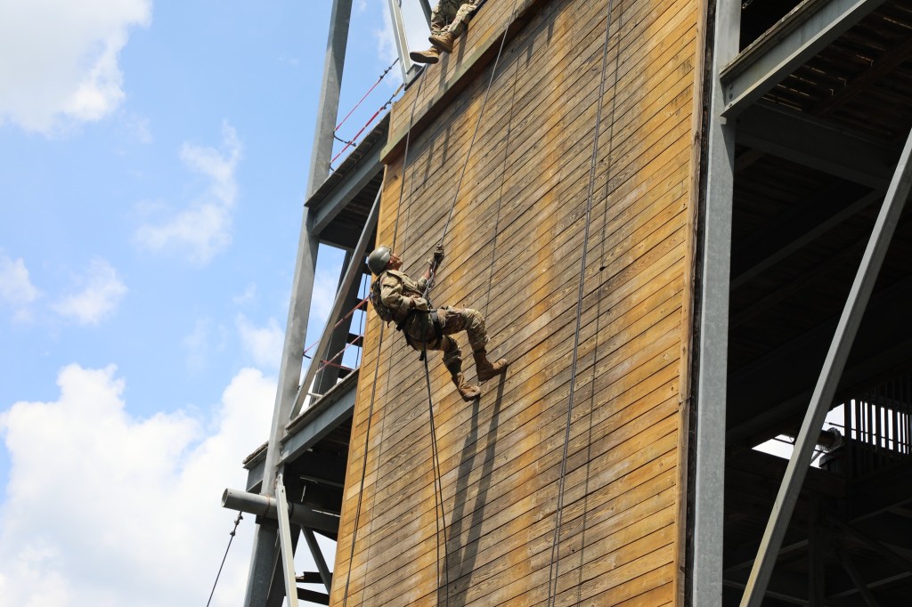 The next confidence builder in the second or early third week is Victory Tower. Victory Tower (Warrior Tower at Fort Leonard Wood) is a 40 foot high rappel tower. It has a flat wall on one side and open with a rope net on the other side. There are also one, two, and three rope traverses.