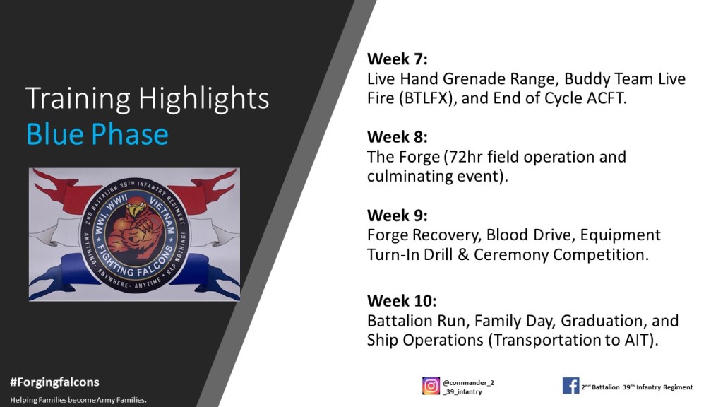 Army Basic Combat Training (BCT) is conducted at Fort Jackson, South Carolina, Fort Leonard Wood, Missouri, Fort Moore (formerly Fort Benning), Georgia, and Fort Sill, Oklahoma. All basic training units have facebook pages and are very open about keeping families posted on what their soldiers are doing, during basic training. At Forts Leonard Wood, Moore, and Sill basic training companies graduate individually, at Fort Jackson basic training cycles are run by battalions and all companies in the battalion graduate together. I chose to follow one battalion at Fort Jackson, because they do a very good job of maintaining their facebook page. The 2nd Battalion and the 4th Battalion of the 39th Infantry are very similar with their postings,