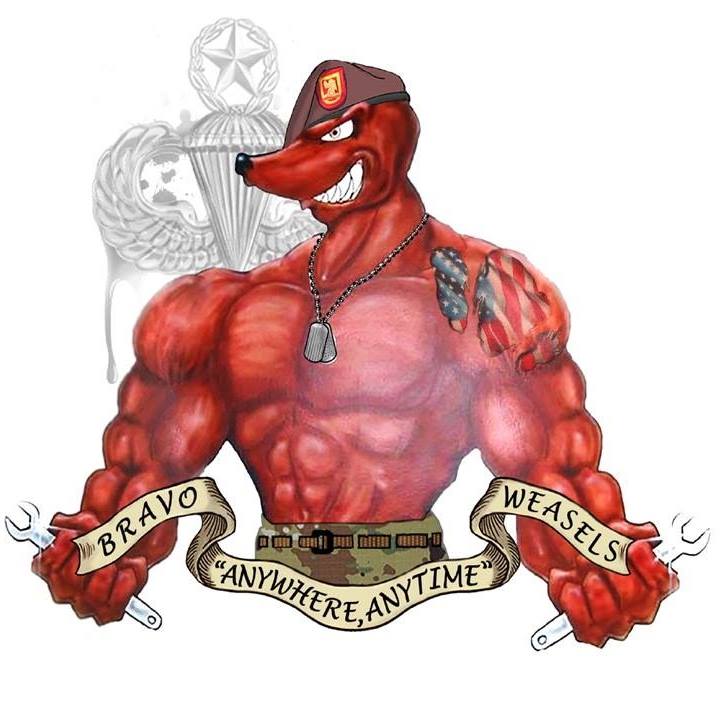 The 407th BSB is part of the 2nd Brigade Combat Team. The 2nd Brigade is the Falcon Brigade, built around the 325th Infantry, whose mascot is the Falcon. The 1st Battalion 325th is the Red Falcons, the 2nd the White Falcons, and the 1st Squadron 73rd Cavalry the Blue Falcons. But the 407th BSB, whose motto is “Supply is Strength”, call themselves “The Golden Griffins”. A “Griffin” is a mythical character with the body of a Lion and the head and wings of an Eagle. The Golden Griffins take on their roll of support with a gusto not seen is most support units. Company B is the Maintenance Company, the mechanics, they call themselves the “Weasels”.
