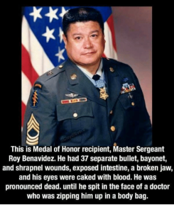 When the enemy soldier clubbed him from behind it knocked him down and broke his jaw. The NVA soldier then tried to stab Benavidez with a bayonet on his rifle, Roy grabbed the bayonet, knowing it would cut his hand, and pulled the enemy to him while he stabbed the NVA with his knife in his other hand. From that point on he couldn’t talk because of the broken Jaw. When he was pulled into the helicopter, he was trying to hold his intestines in his stomach. He was unconscious when the helicopter landed. Thinking he was dead, the medics put him in a body bag, and a doctor who was checking the bodies in the body bags started to zip up Roy’s bag. Roy said he woke up and realized where he was, but he couldn’t talk. He said he could hear that zipper moving and he then said that he made the greatest shot of his life, he spat in the doctor’s face.